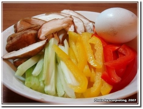 1. 將香菇切片,彩椒西洋芹切成細條狀,蛋打散備用。