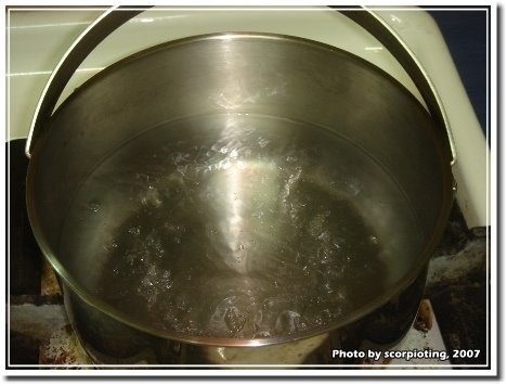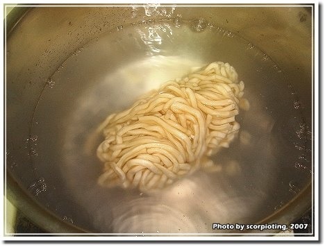 4. 一鍋滾水,放入拉麵後以筷子拌開,水滾後加入一杯冷水,再滾再加一次冷水,滾後約12分鐘就可以撈起放入碗中備用。